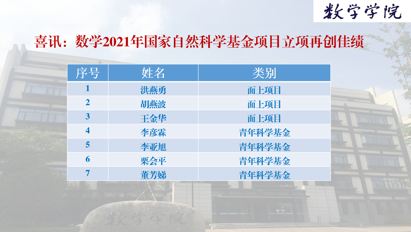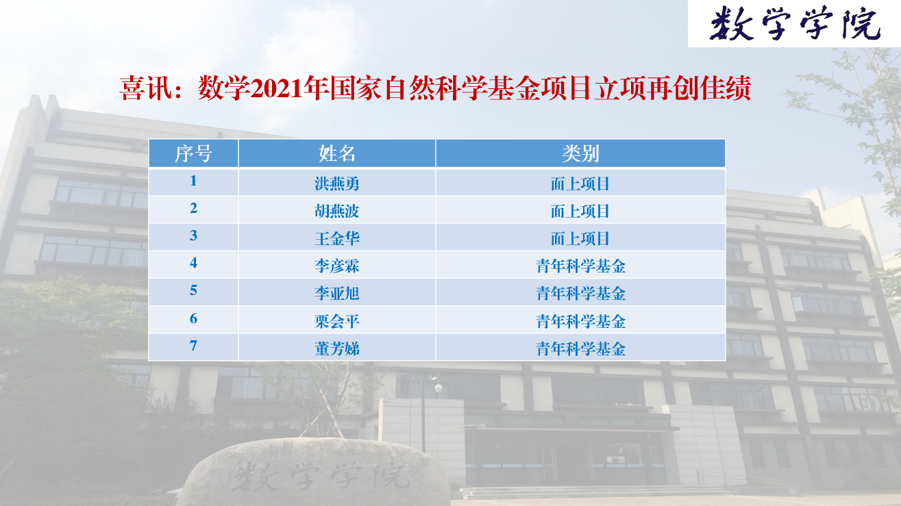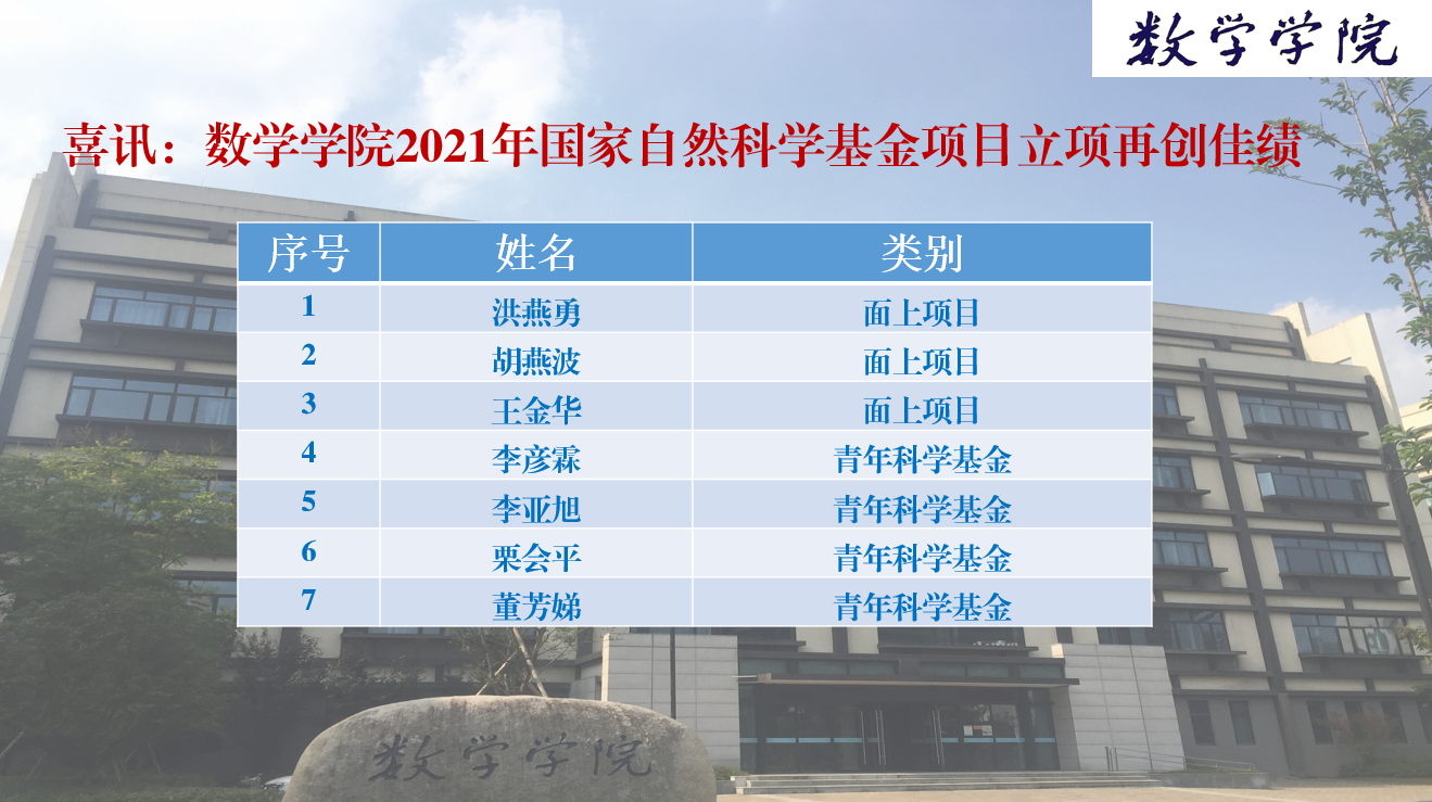 日前,国家自然科学基金委员会(NSFC)公布了2021年国家自然科学基金评审结果。麻豆视频 今年国家自然科学基金项目申报取得佳绩,共有7个项目获立项资助,其中面上项目3项,青年科学基金项目4项。