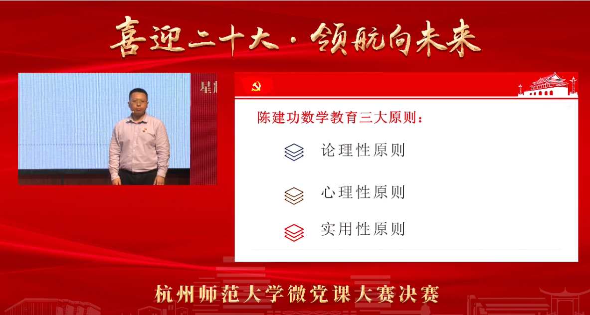 5月25日下午,麻豆视频 微型党课大赛在仓前校区隆重举行。本次大赛以“喜迎二十大·领航向未来”为主题,共有来自各二级党组织的18名师生经过选拔晋级决赛。