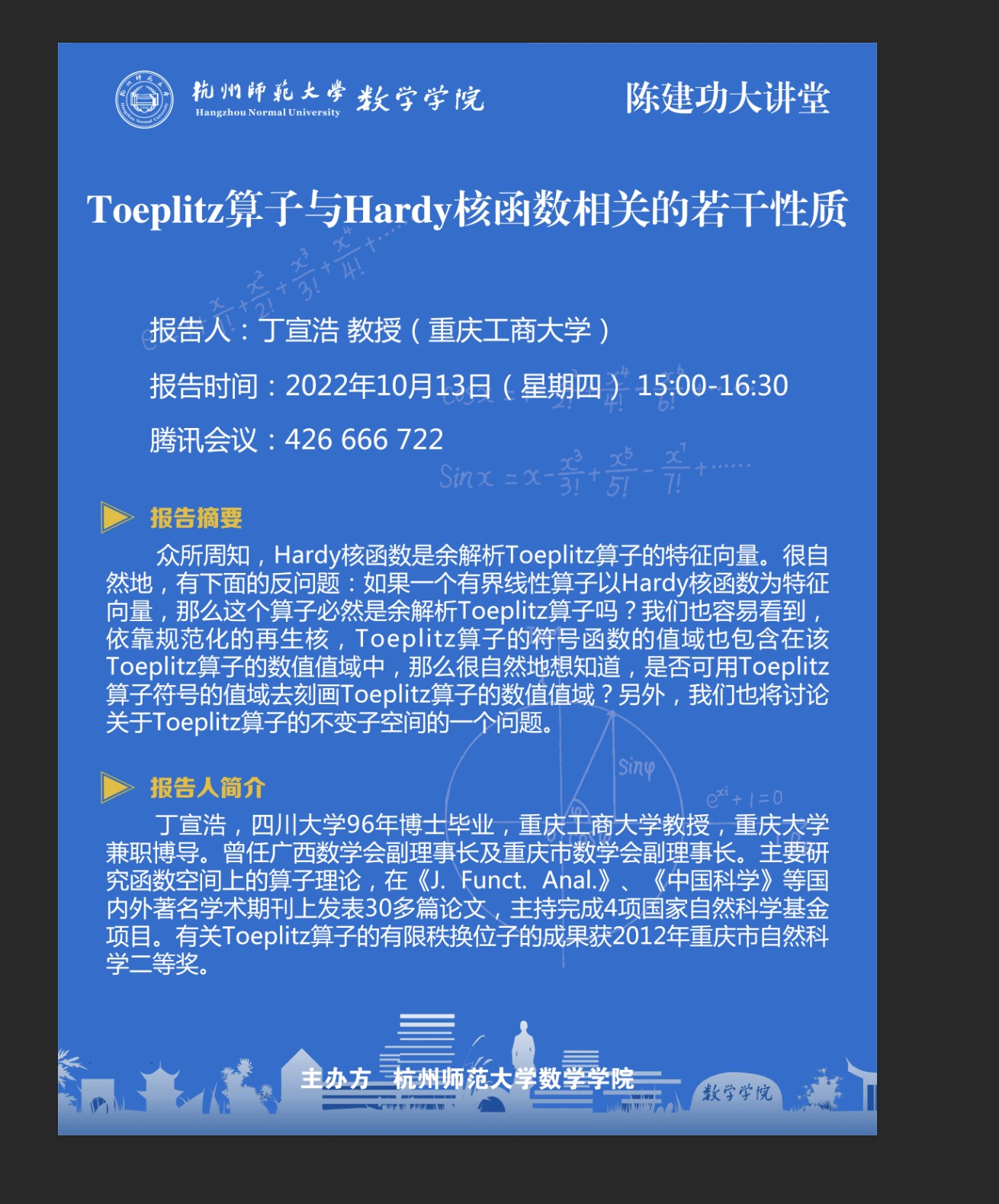 陈建功大讲堂:Toeplitz算子与Hardy核函数相关的若干性质