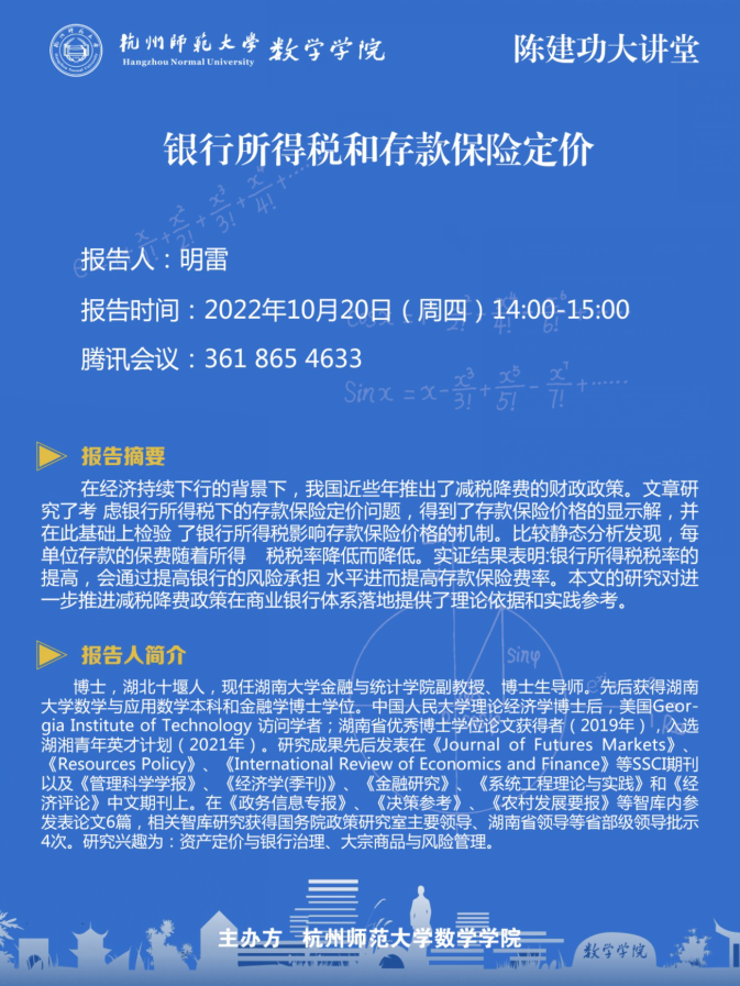 陈建功大讲堂:银行所得税和存款保险定价