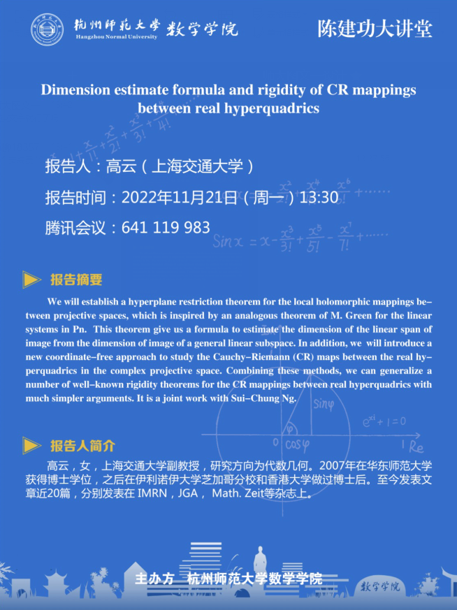 陈建功大讲堂:Dimension estimate formula and rigidity of CR mappings between real hyperquadrics