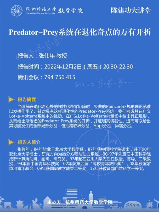陈建功大讲堂:Predator-Prey系统在退化奇点的万有开折