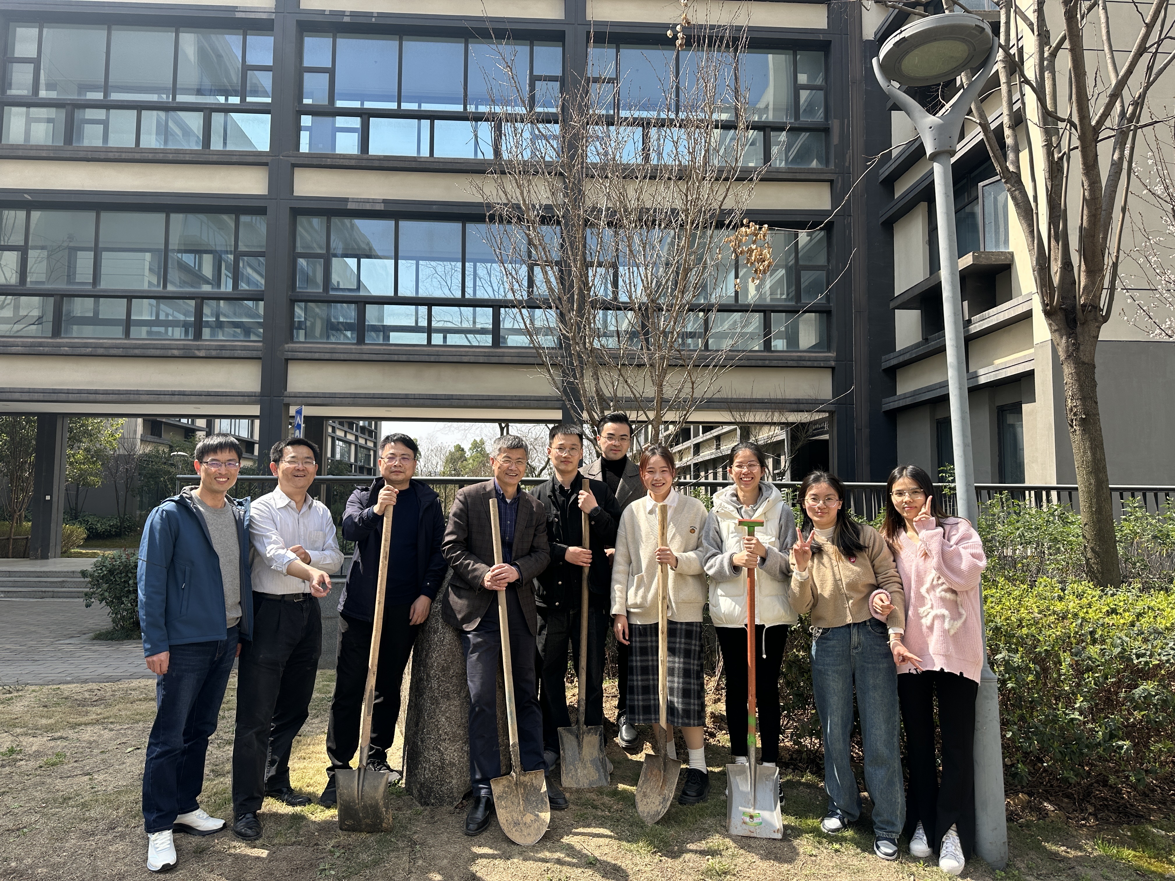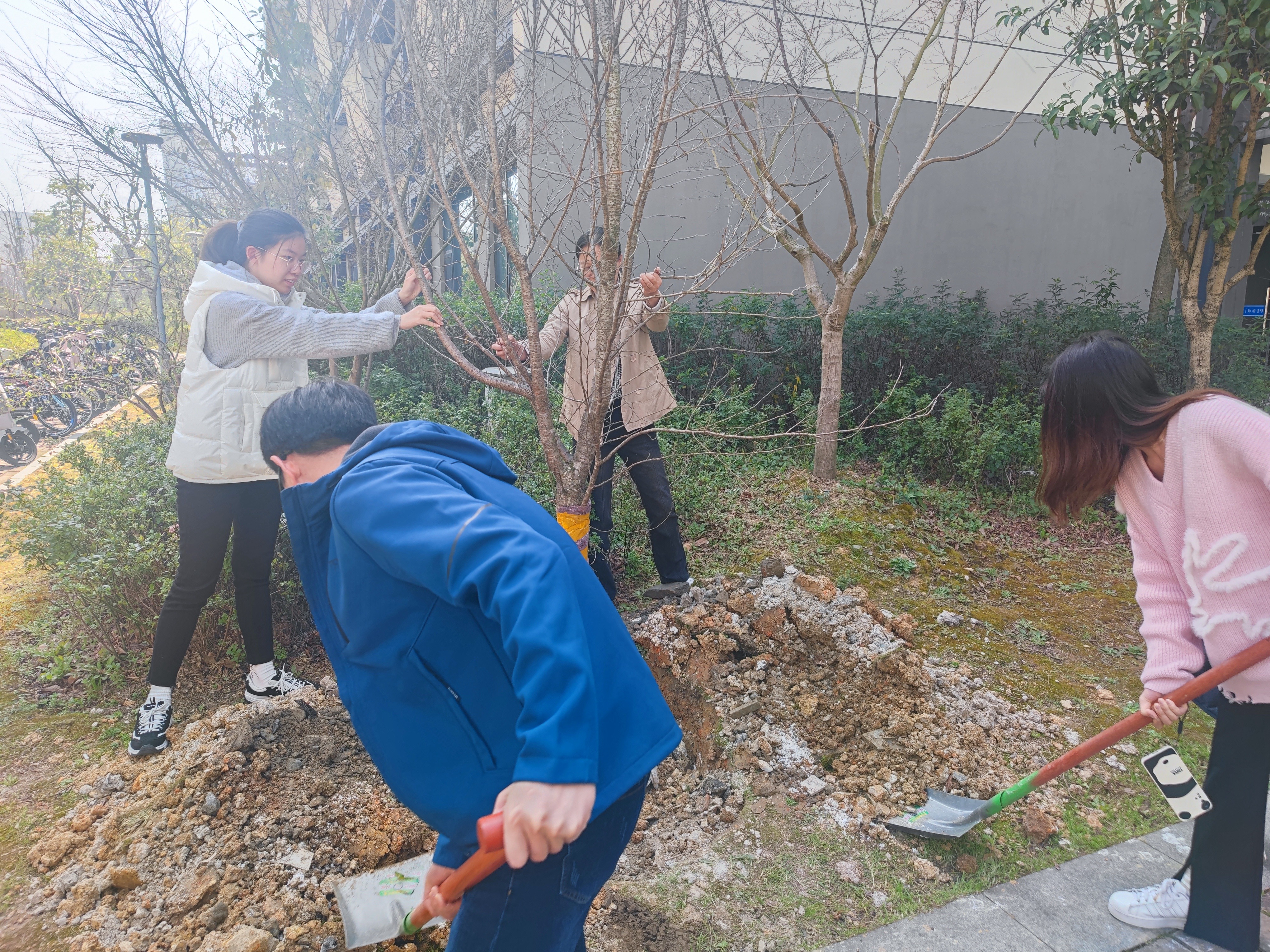 在植树现场,大家扶树正苗、挥锹培土、填坑浇水……分工协作、干劲十足,种下6株樱花树,这6株樱花树分别由2023届5个本科毕业班和研究生毕业班的同学们捐赠。阳光下、微风里,一株株新苗迎风挺立,散发出勃勃生机。