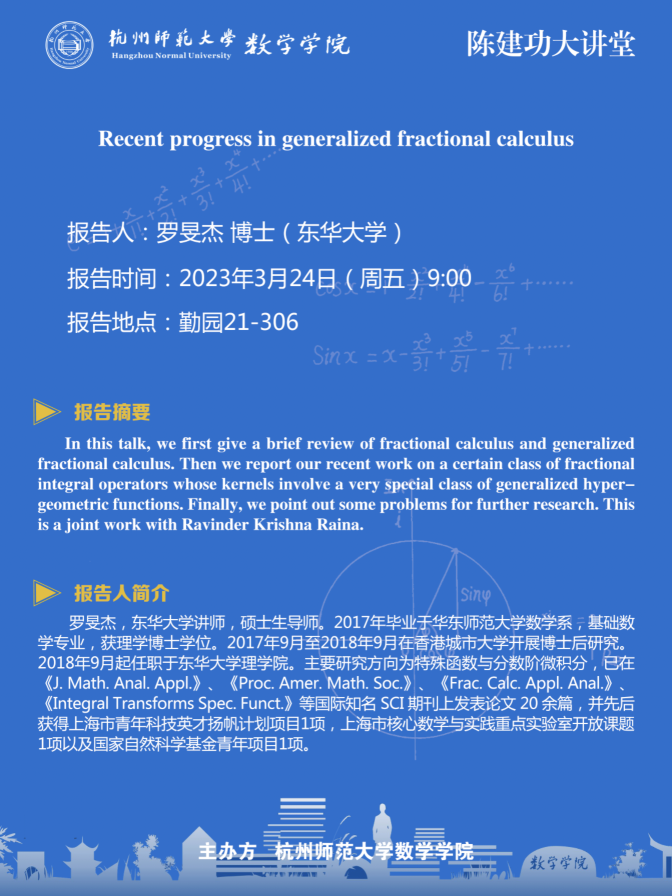 陈建功大讲堂:Recent progress in generalized fractional calculus