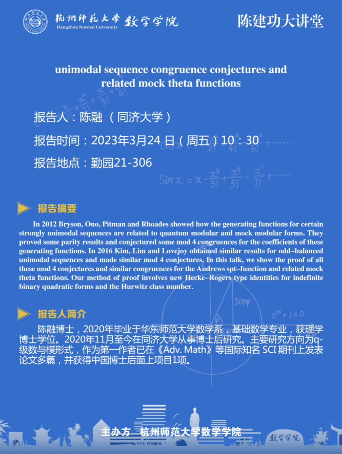 陈建功大讲堂:unimodal sequence congruence conjectures and related mock theta functions
