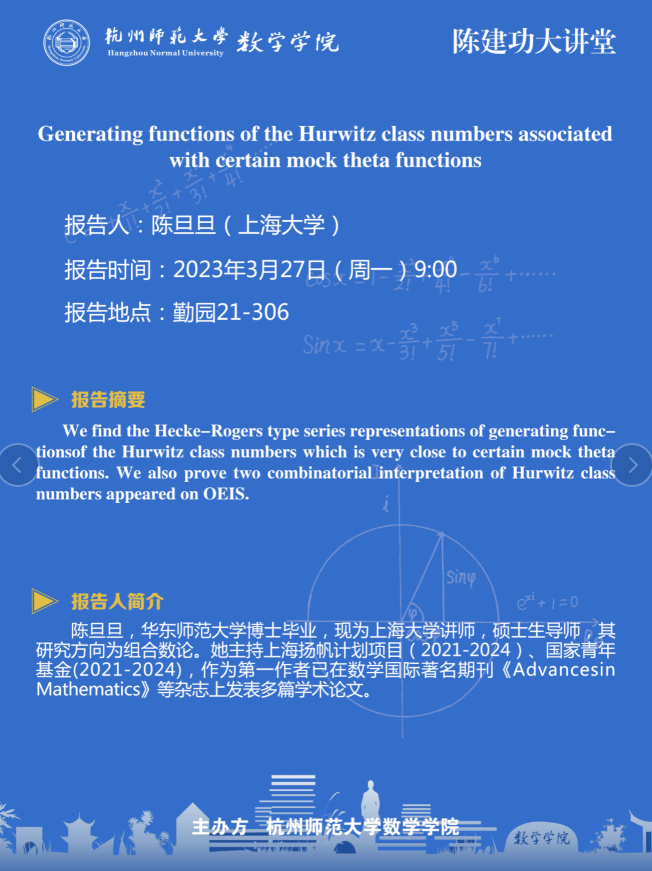 陈建功大讲堂:Generating functions of the Hurwitz class numbers associated with certain mock theta functions
