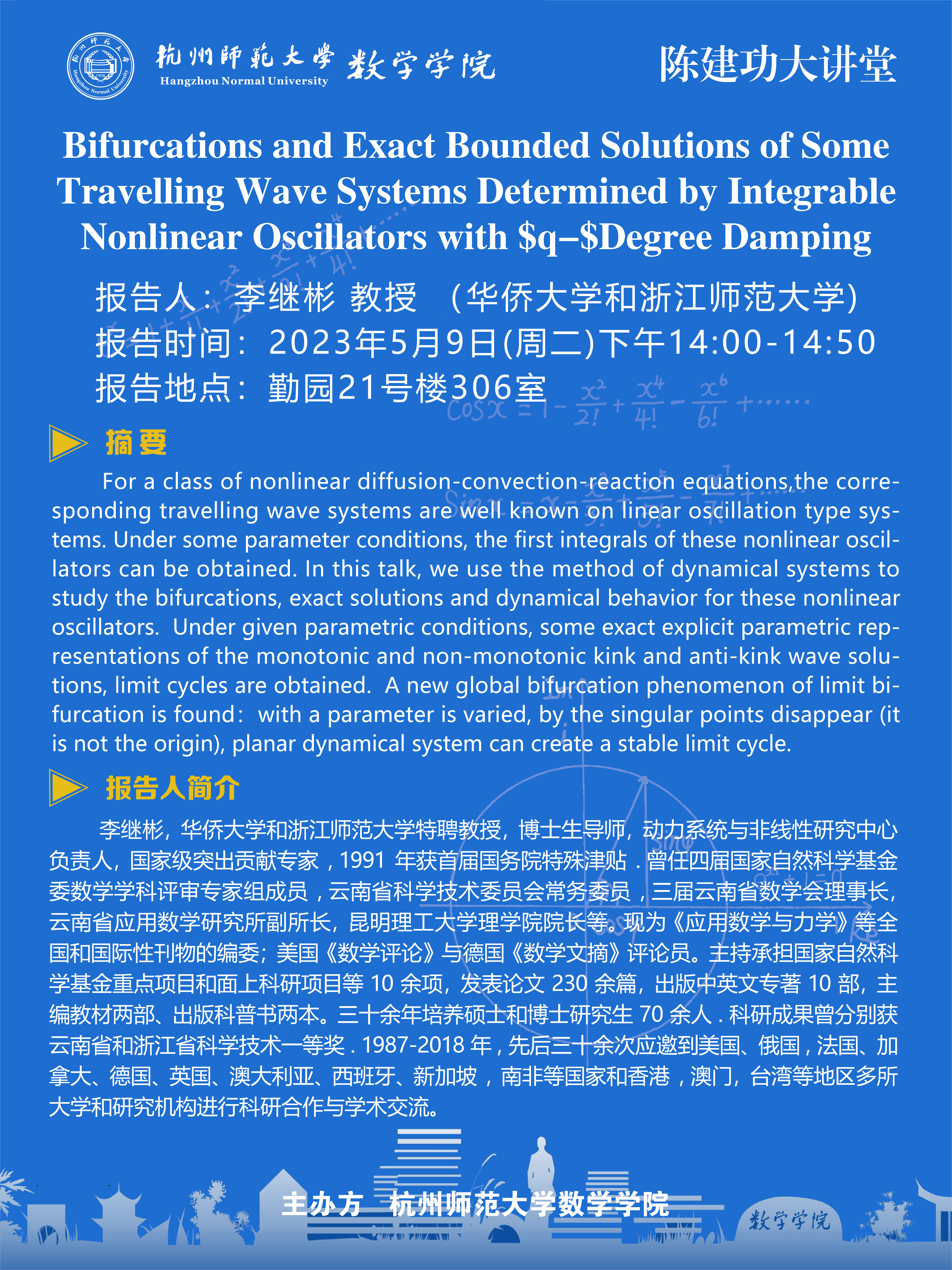 陈建功大讲堂:Bifurcations and Exact Bounded Solutions of Some Travelling Wave Systems Determined by Integrable Nonlinear Oscillators with $q-$Degree Damping