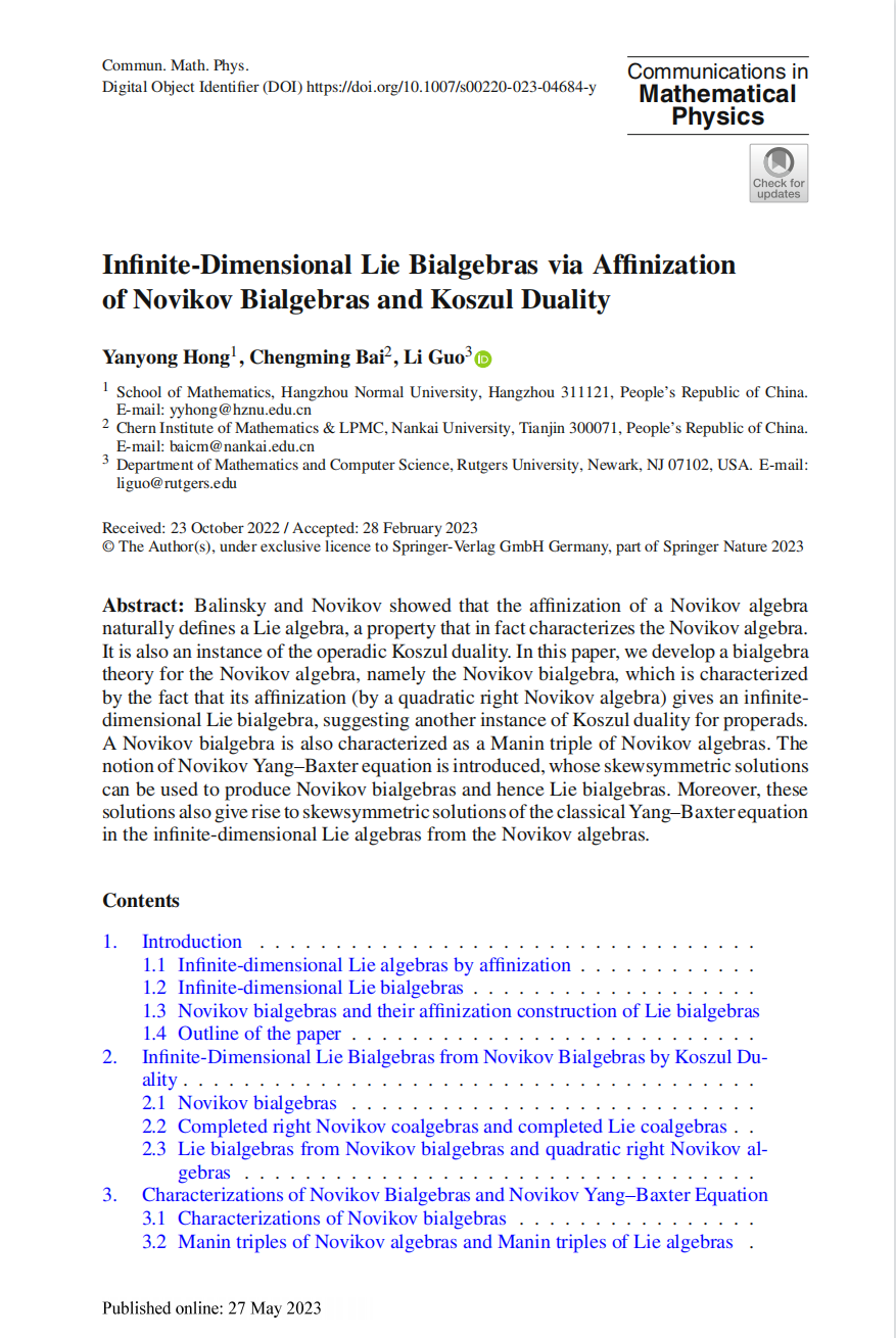 近日,学院教师洪燕勇教授,与南开大学的白承铭教授、 Rutgers University的郭锂教授合作,在国际数学物理顶级期刊《Communications in Mathematical Physics》发表题为《Infinite-Dimensional Lie Bialgebras via Affinization of Novikov Bialgebras and Koszul Duality》的学术论文。在该论文中,作者利用Novikov代数与一类无限维李代数的一一对应关系,建立了完善的Novikov双代数理论,并给出了无限维李双代数以及经典Yang-Baxter方程解的自然的构造。该结文为无限维李双代数的研究提供了新的思想和方法,是麻豆视频 在代数方向研究的重要突破。