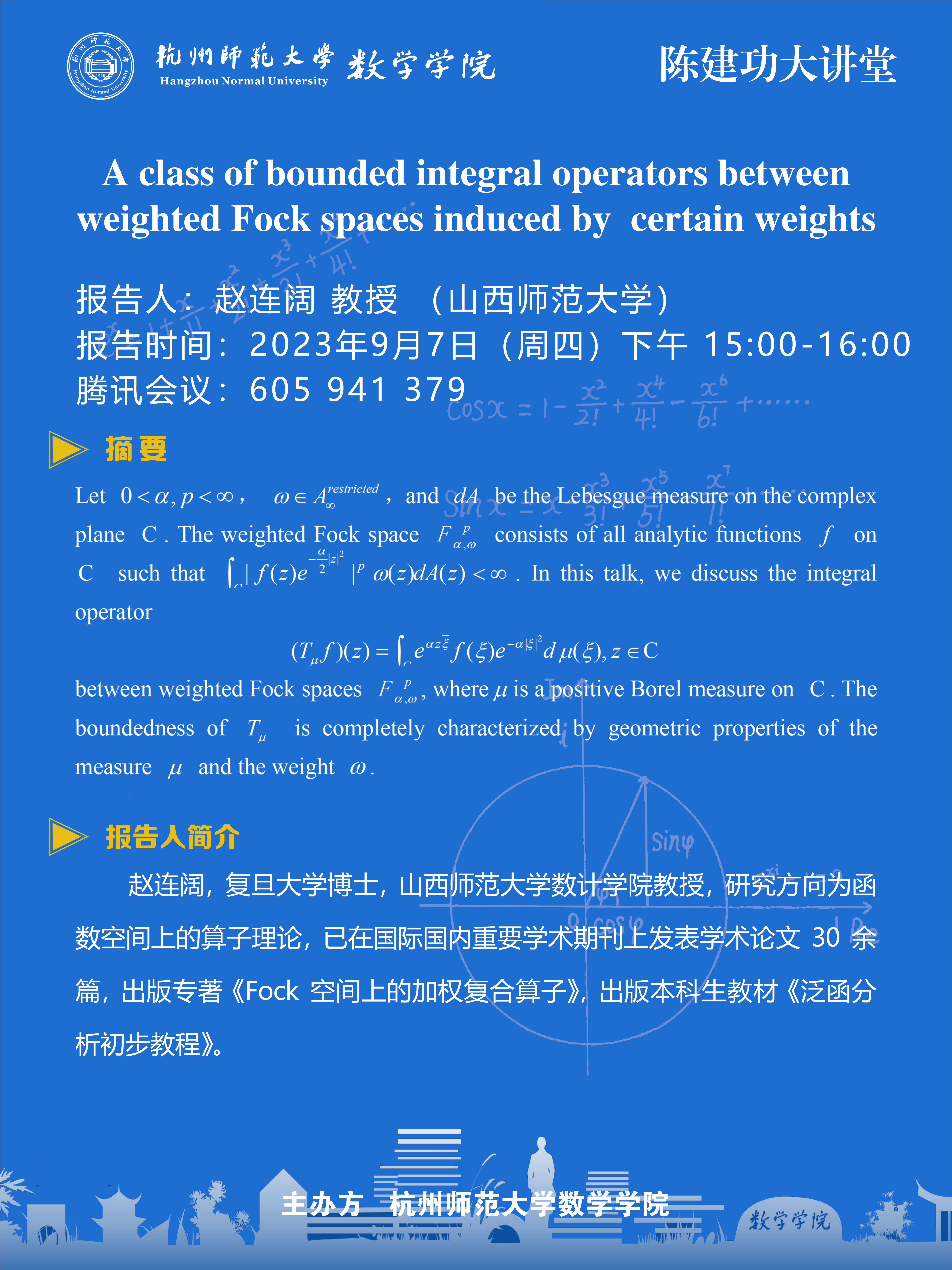 陈建功大讲堂:A class of bounded integral operators between weighted Fock spaces induced by certain weights