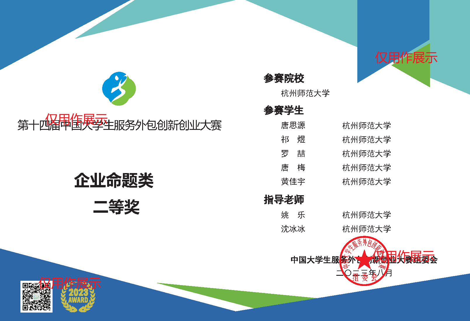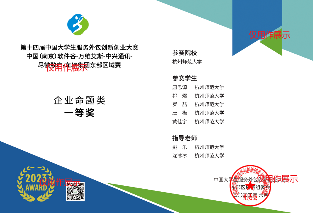 获得奖项:全国决赛二等奖、东部省份区域赛一等奖(杭师大唯二)