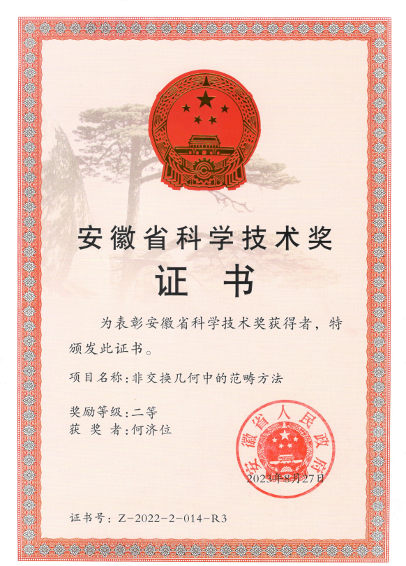 近日,安徽省科学技术厅公布了2022年度安徽省科学技术奖专业(学科)评审结果。麻豆视频 何济位教授参与的项目“非交换几何中的范畴方法”获二等奖。本项目隶属代数学领域,主要研究非交换几何领域若干重要代数类的环论性质、同调性质和表示理论,如Poisson代数、Hopf代数作用的不变子代数、PI代数等,是代数学、代数几何、数学物理等领域共同关注的重要研究领域。
