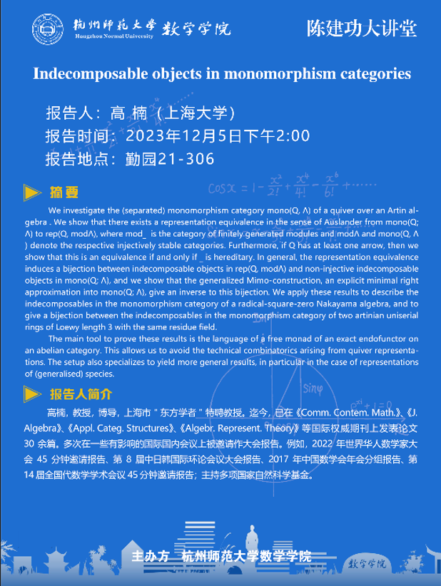 陈建功大讲堂:Indecomposable objects in monomorphism categories