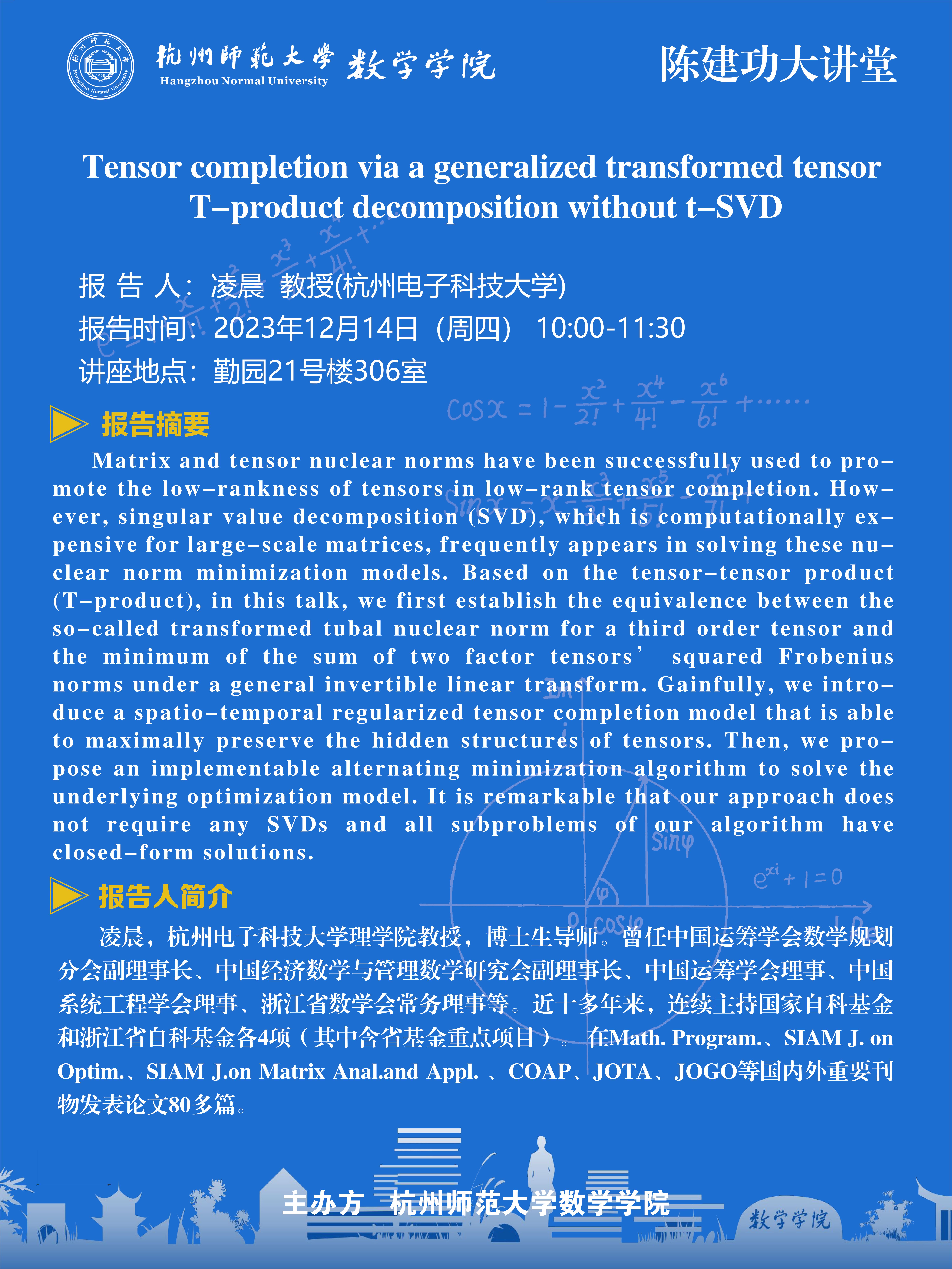 陈建功大讲堂:Tensor completion via a generalized transformed tensor T-product decomposition without t-SVD