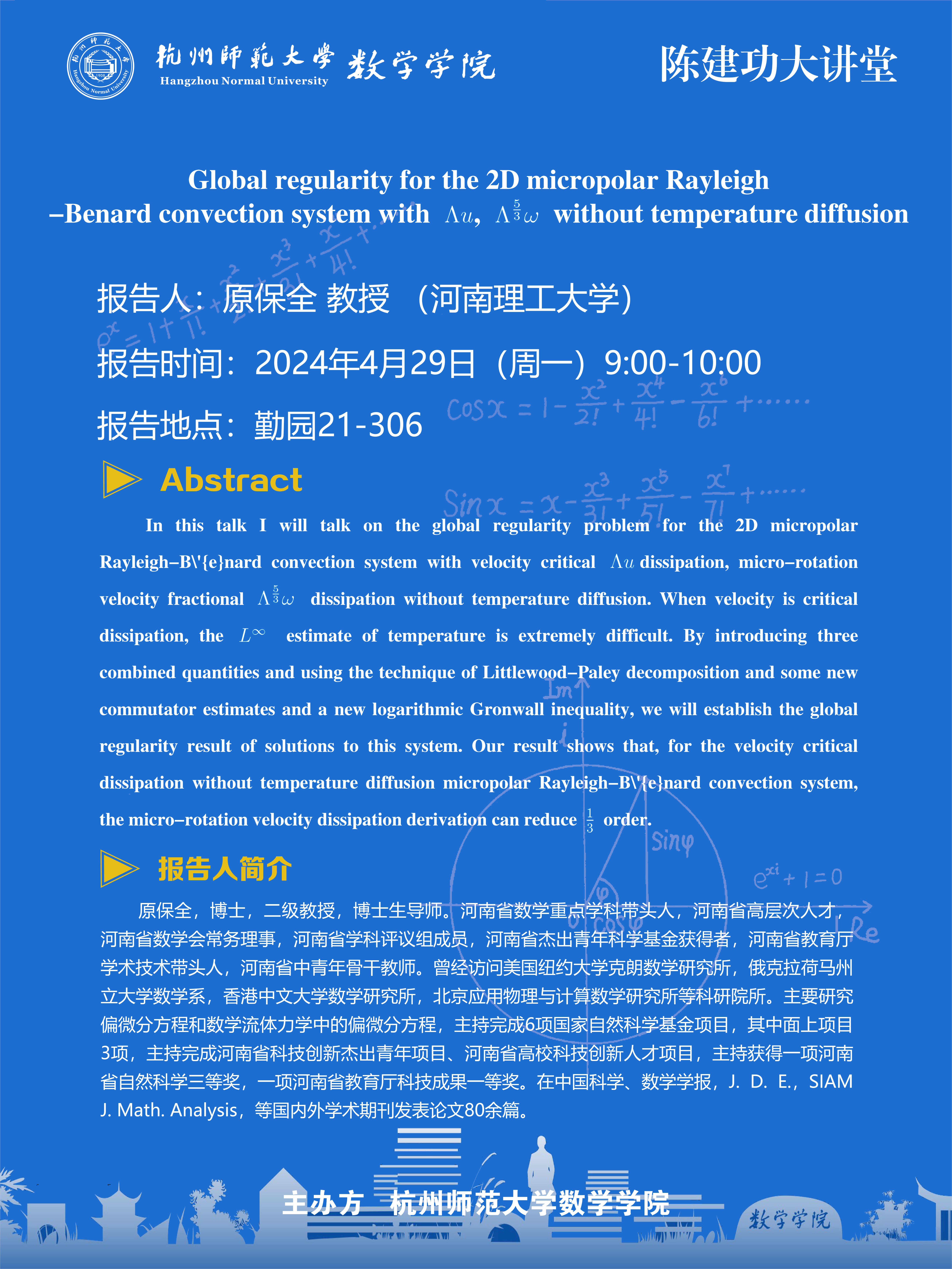 陈建功大讲堂(2024-27):Global regularity for the 2D micropolar Rayleigh-Benard convection system without temperature diffusion Copy1