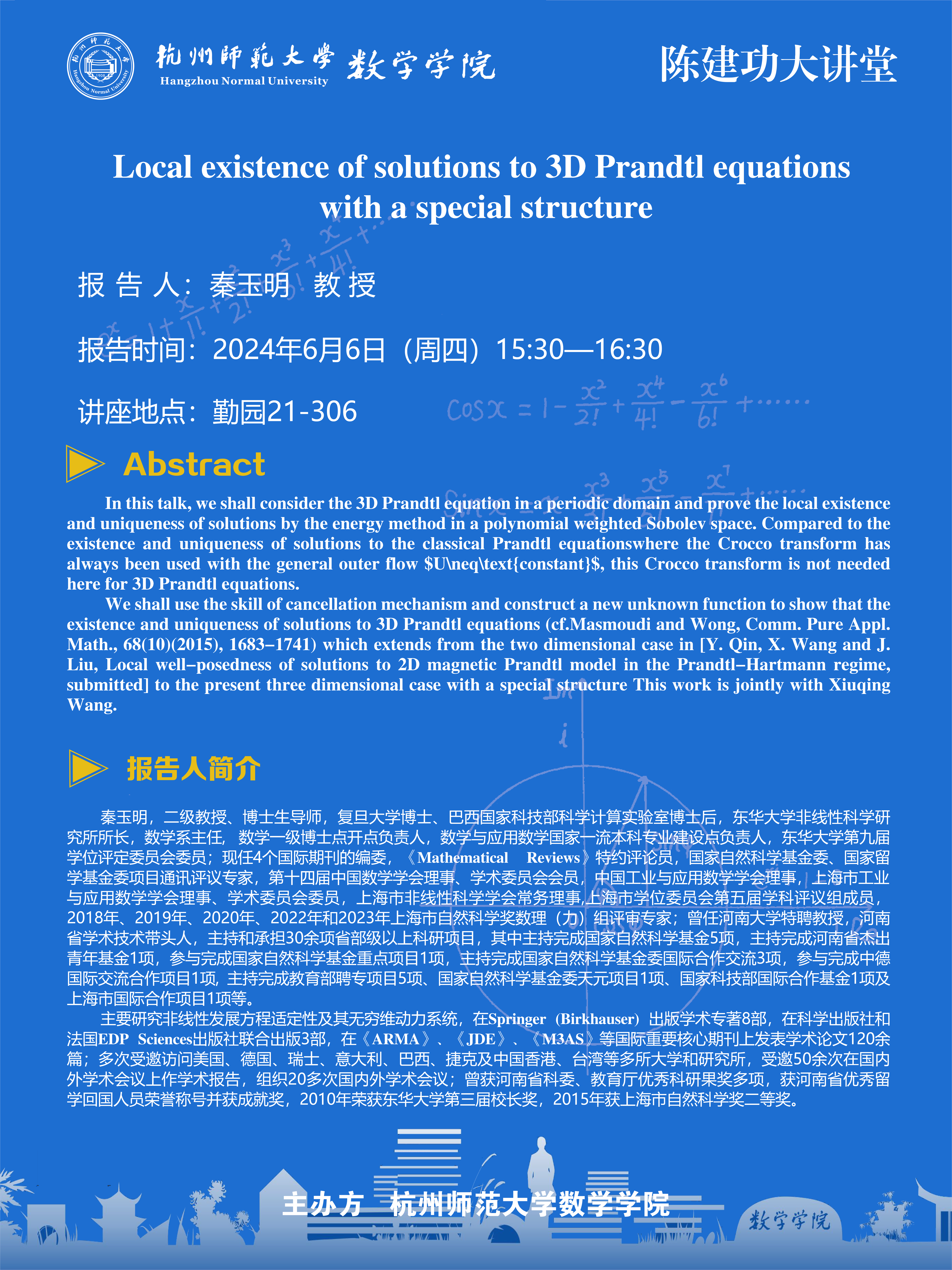 陈建功大讲堂(2024-68):Local existence of solutions to 3D Prandtl equations with a special structure