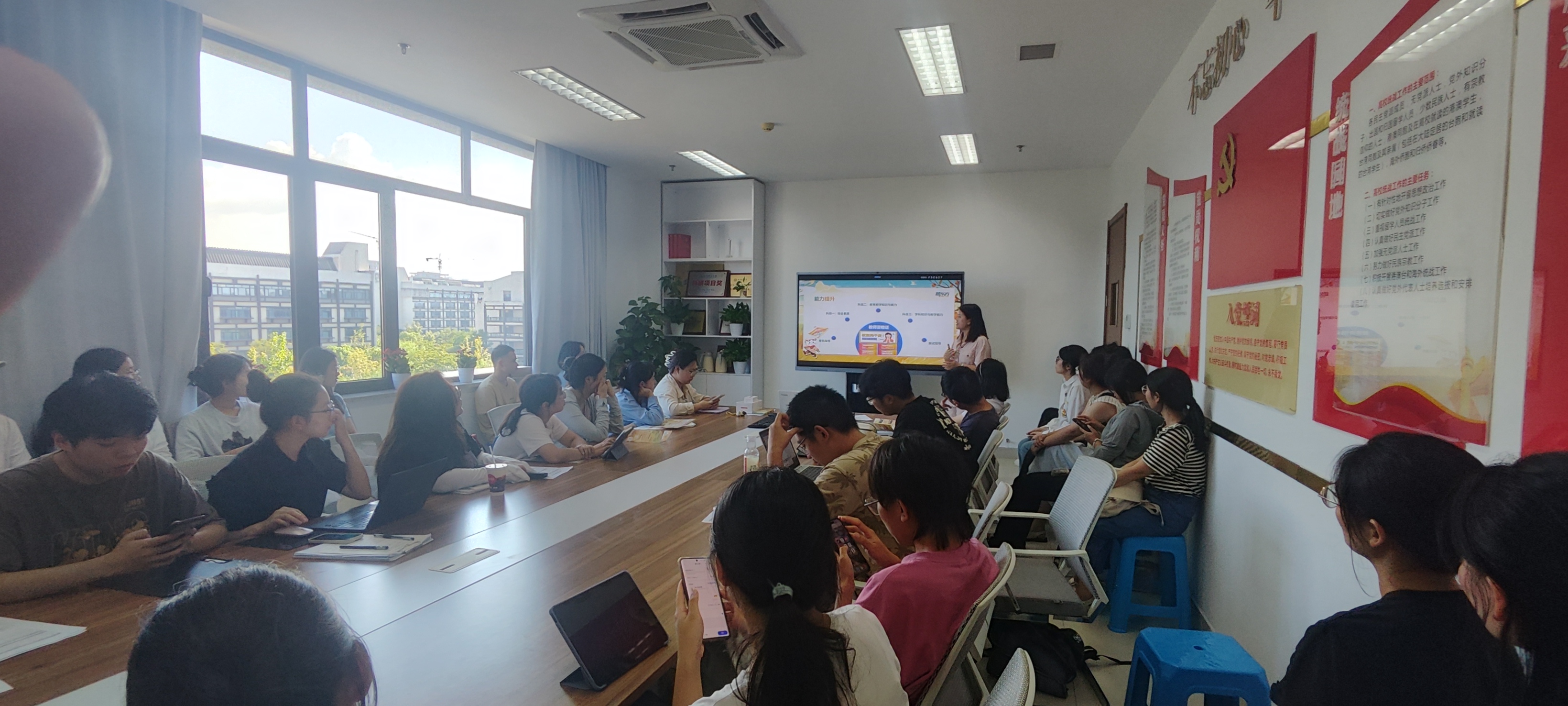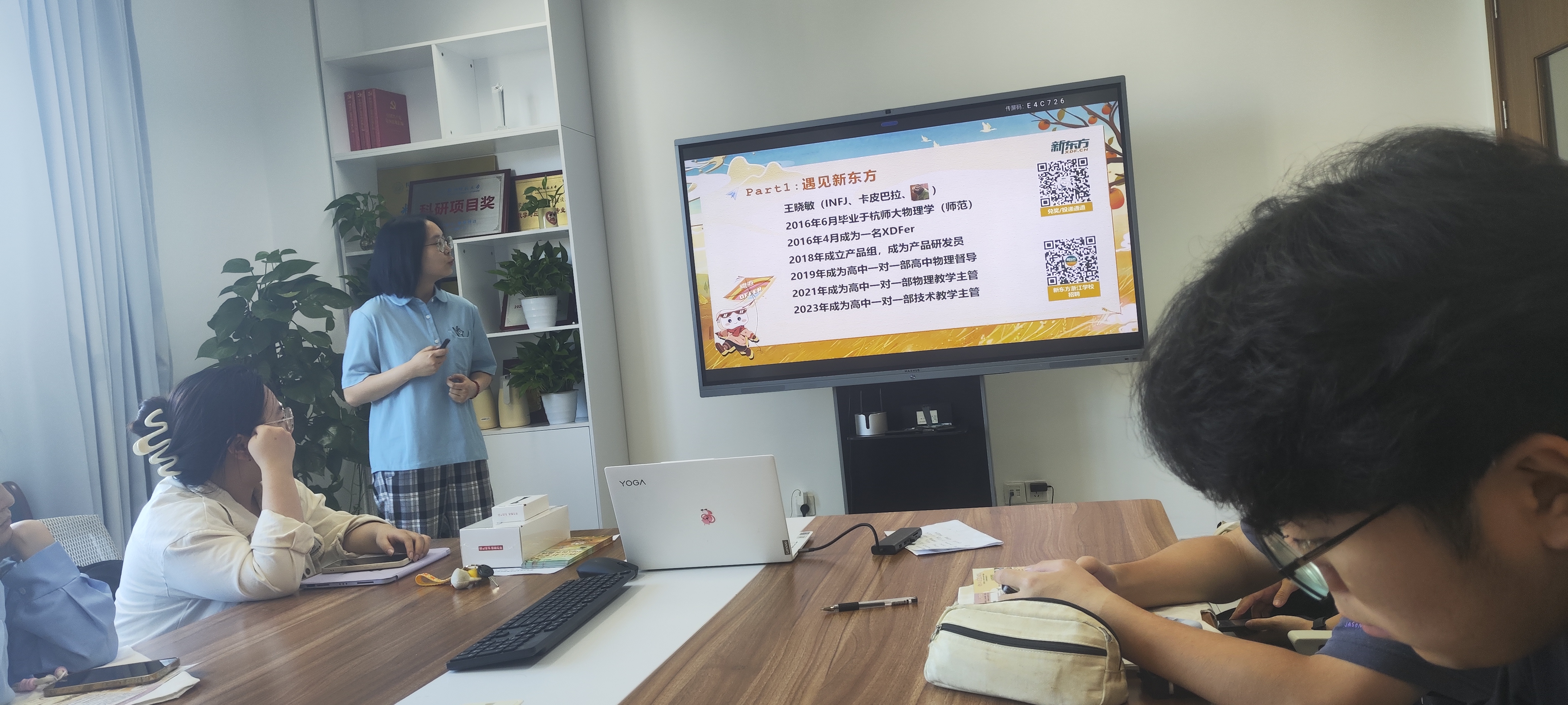 毕业学姐的身份向学弟学妹们进行分享。她从个人经历出发,给同学们提供了多点具有建设性意义的求职建议,内容包括职业规划、证书、面试准备三个大点八个小点,给同学们非常大的启发。此外,她还向我们分享了新东方的日常生活,引发了大家对未来的无限期待。
