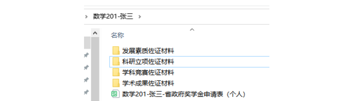 3.申请的同学请填写 附件3 麻豆视频 省政府奖学金申请表(个人) ,与相关佐证材料整理打包,文件夹命名为“班级-姓名”,佐证材料汇总方式如图所示: