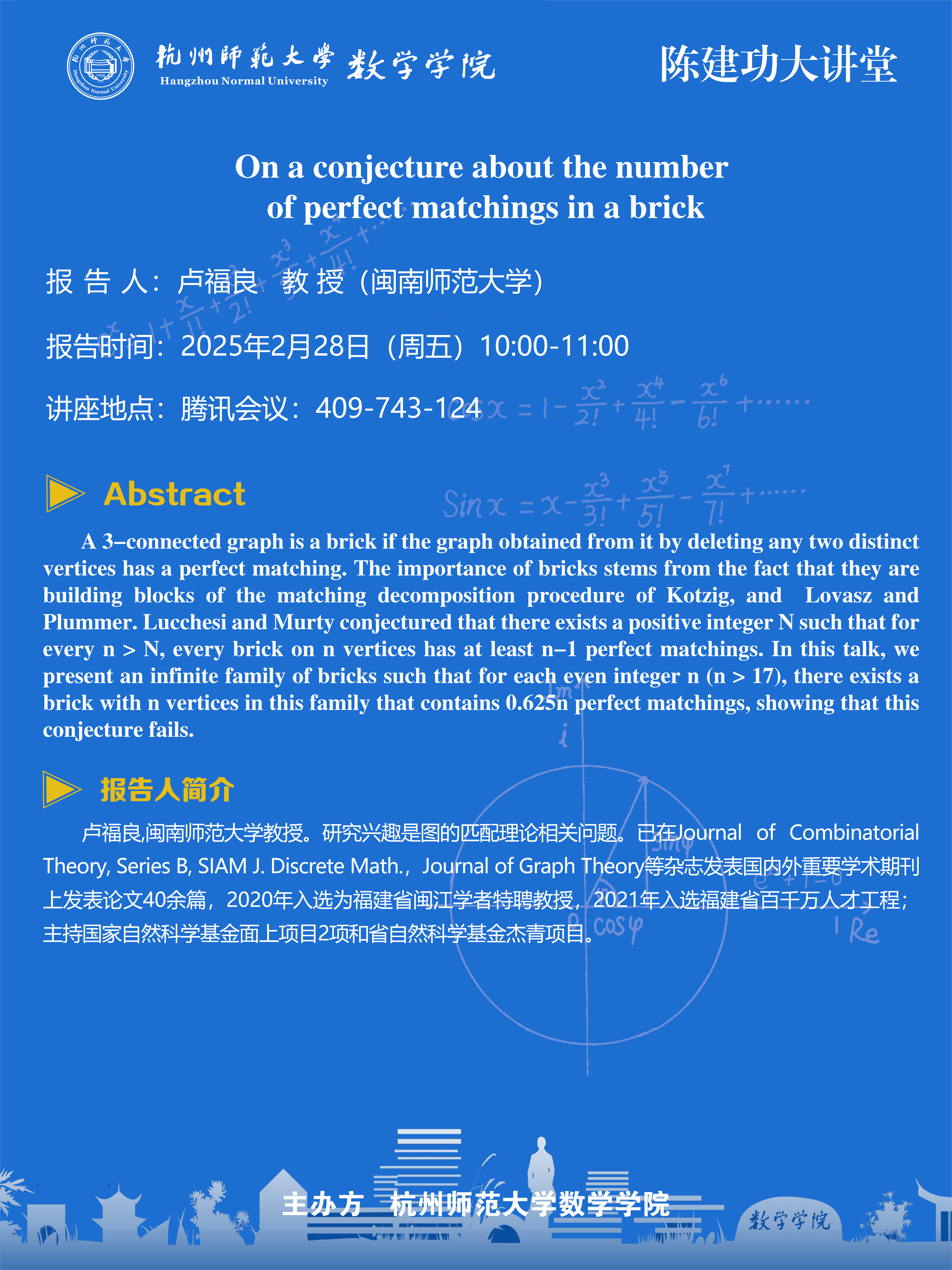 陈建功大讲堂(2025-7):On a conjecture about the number of perfect matchings in a brick