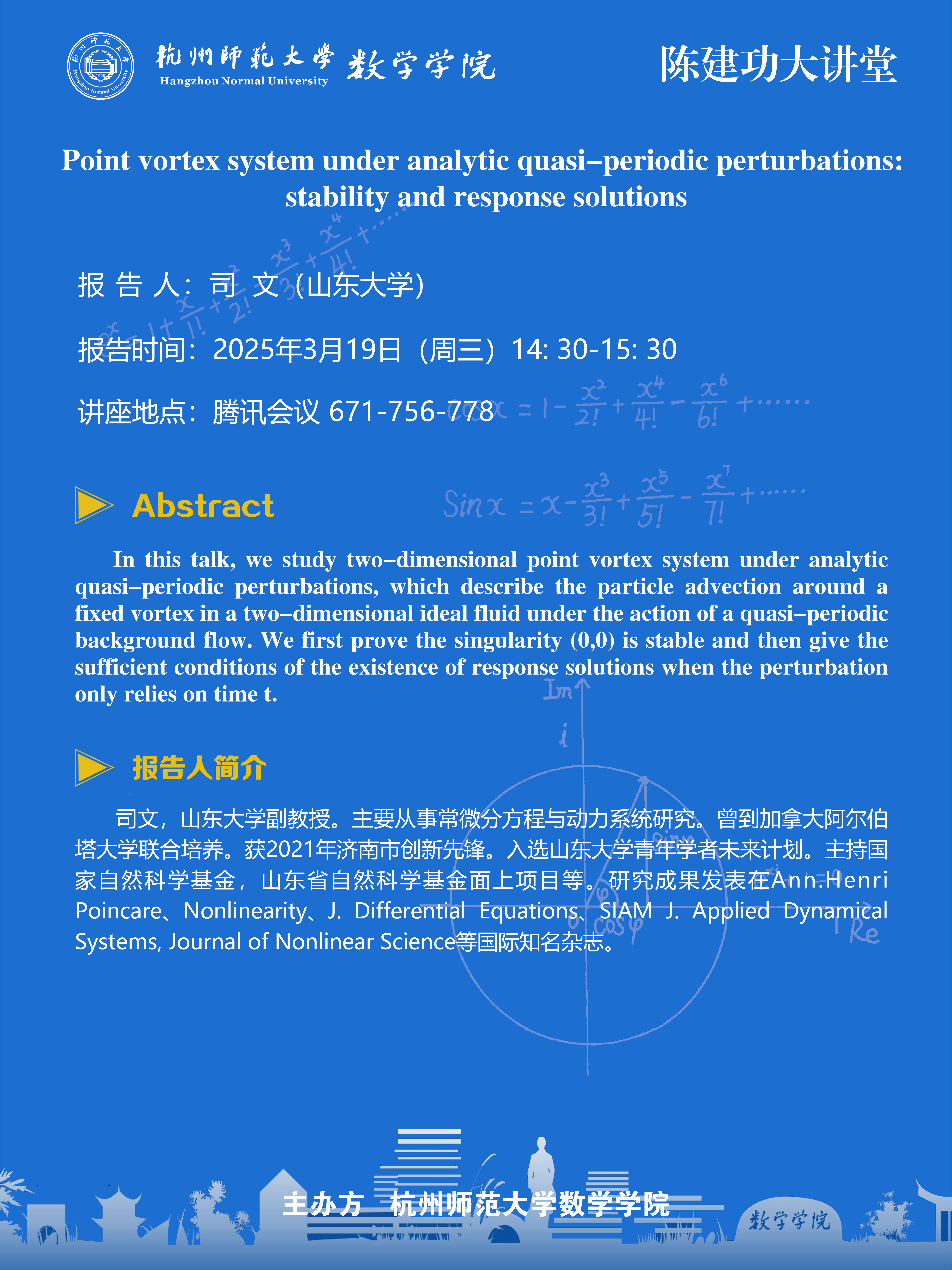 陈建功大讲堂(2025-14):Point vortex system under analytic quasi-periodic perturbations: stability and response solutions