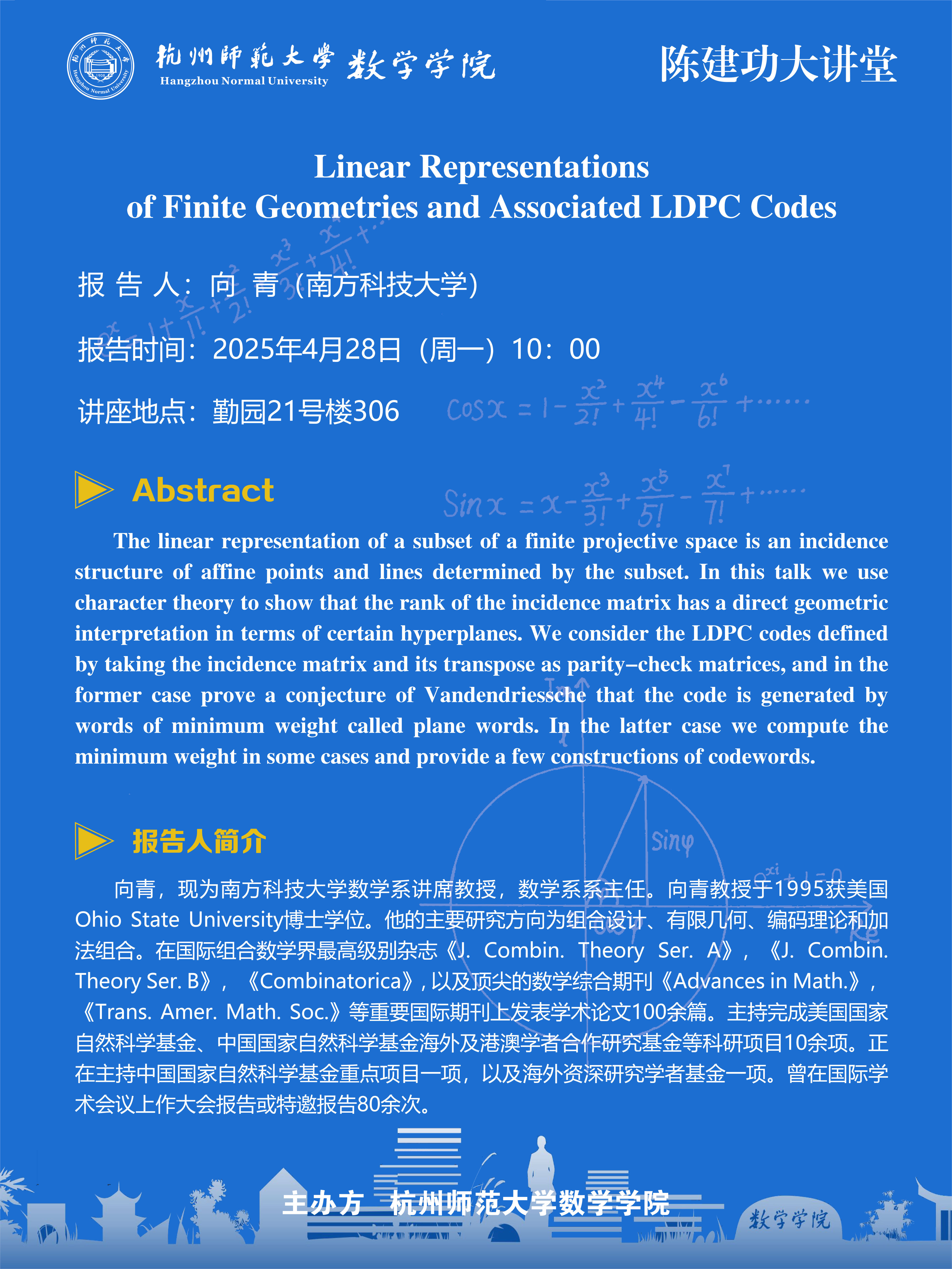 陈建功大讲堂(2025-24):Linear Representations of Finite Geometries and Associated LDPC Codes