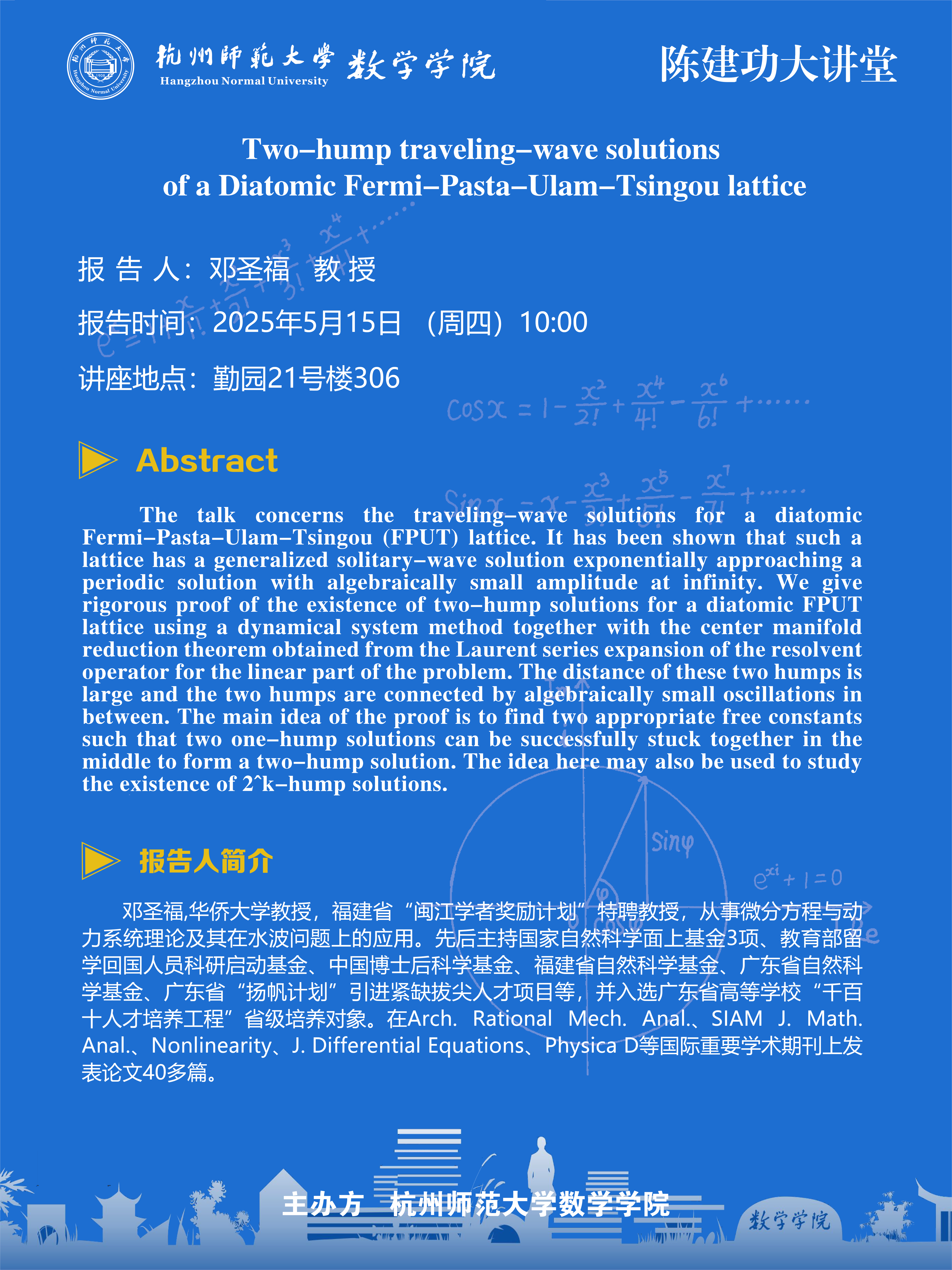 陈建功大讲堂(2025-32):Two-hump traveling-wave solutions of a Diatomic Fermi-Pasta-Ulam-Tsingou lattice