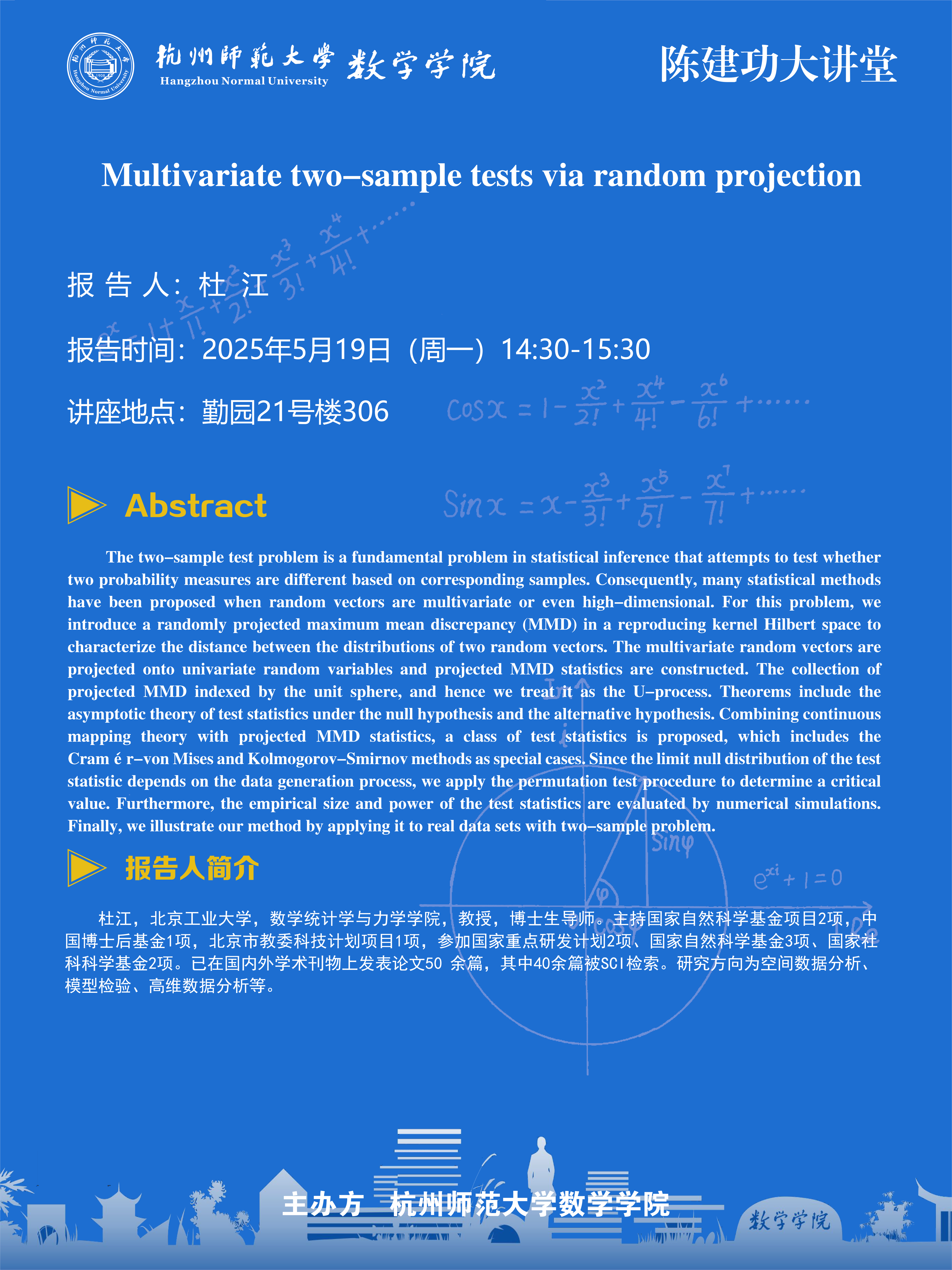 陈建功大讲堂(2025-35):Multivariate two-sample tests via random projection