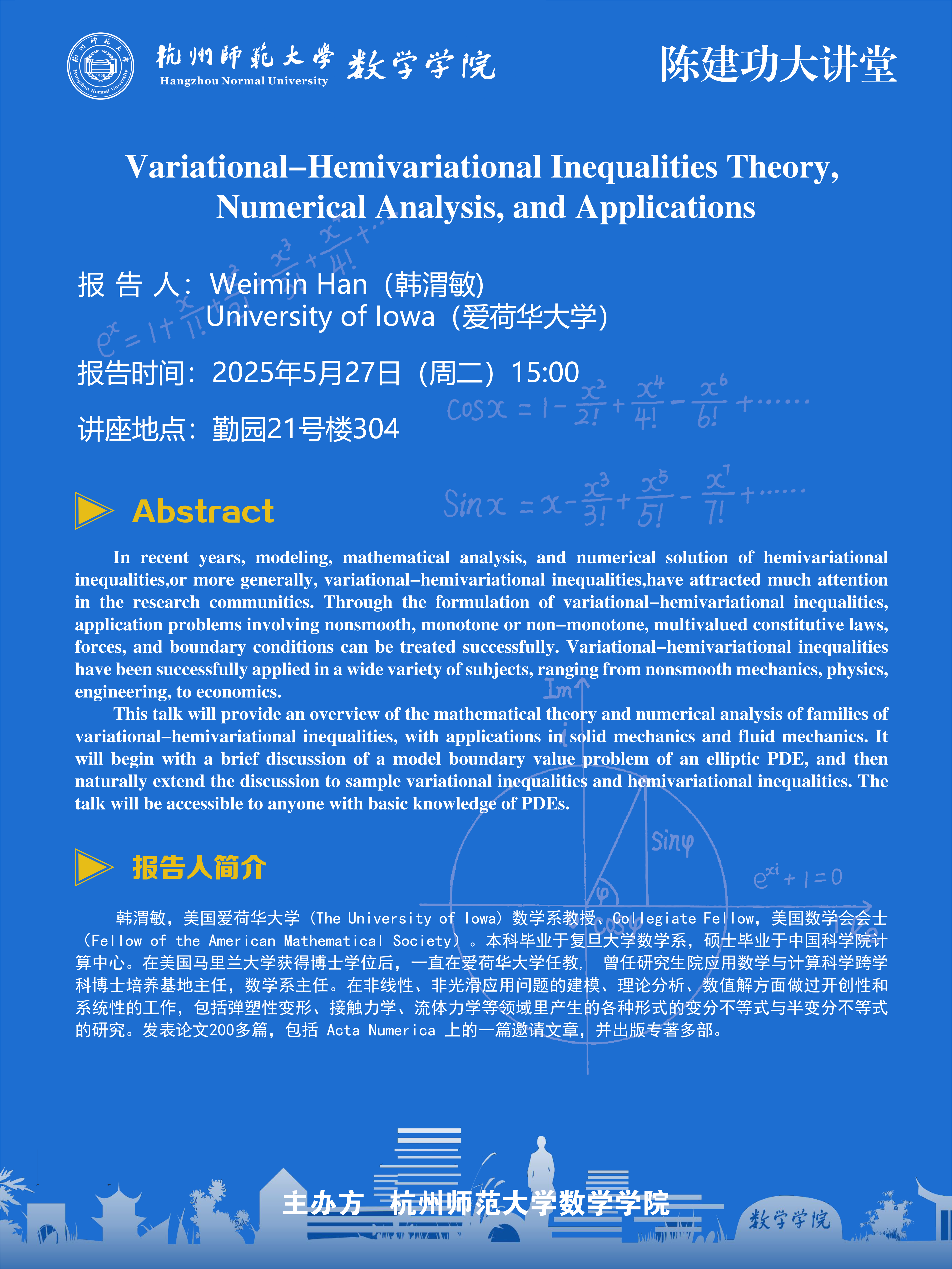 陈建功大讲堂(2025-42):Variational-Hemivariational Inequalities Theory, Numerical Analysis, and Applications