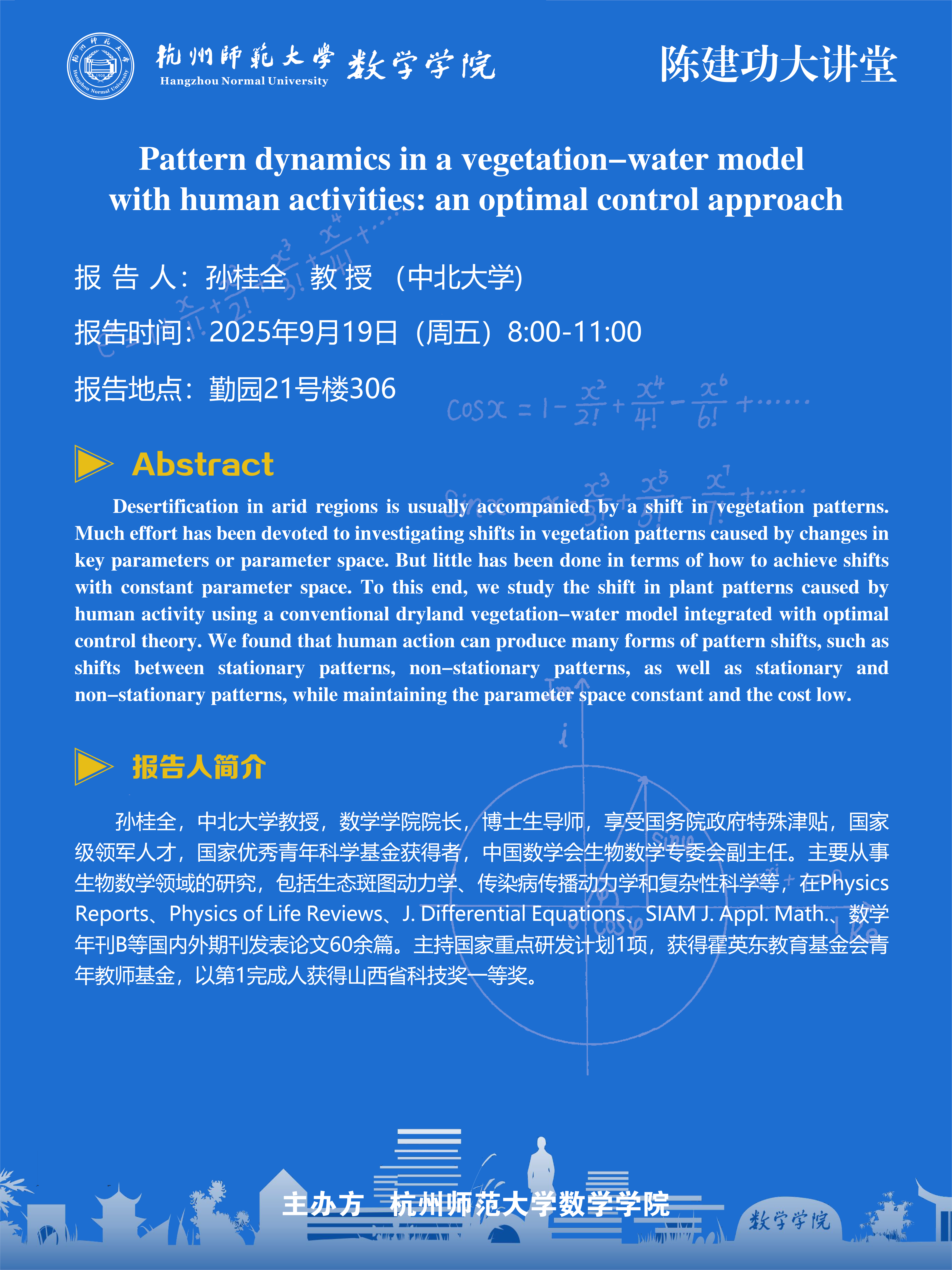 陈建功大讲堂(2025-71):Pattern dynamics in a vegetation-water model with human activities: an optimal control approach
