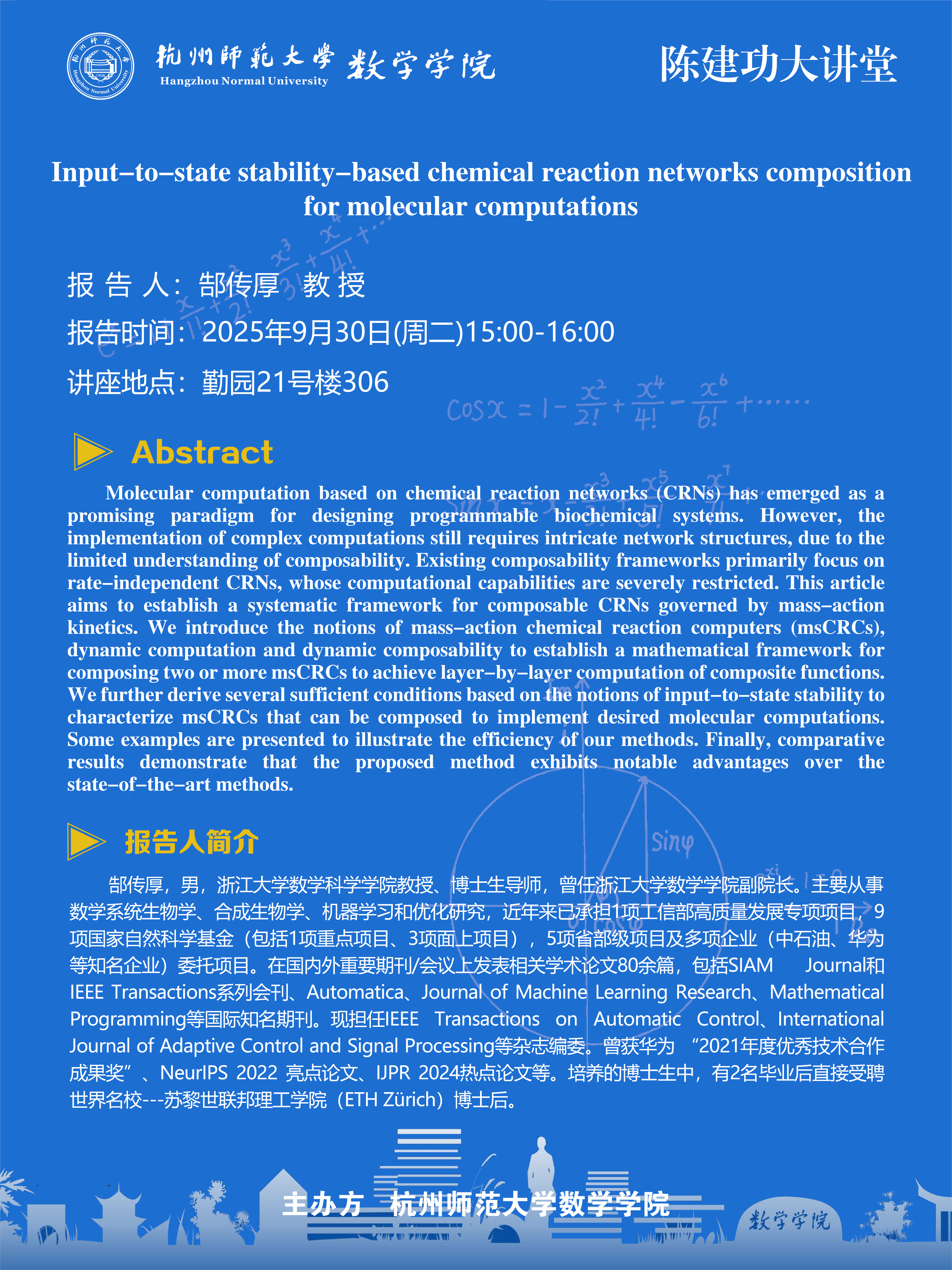 陈建功大讲堂(2025-78):Input-to-state stability-based chemical reaction networks composition for molecular computations