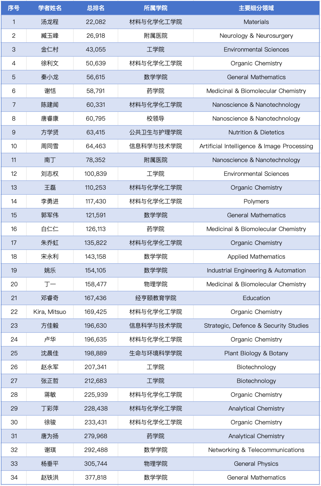 据了解,全球前2%顶尖科学家榜单分为“终身科学影响力排行榜(Career-long Impact)”和“年度科学影响力排行榜(Single-year Impact)”两大部分,从全球近700万名科学家中,通过基于其论文引用数、h因子、合著者修正的hm因子、单独或第一作者的文章引用数等综合参数,遴选出世界排名前2%的科学家,涵盖22个领域和174个子领域。其中,“终身影响力”榜单统计科学家职业生涯期间的综合表现,“年度影响力”榜单则聚焦上一年度的学术影响力。