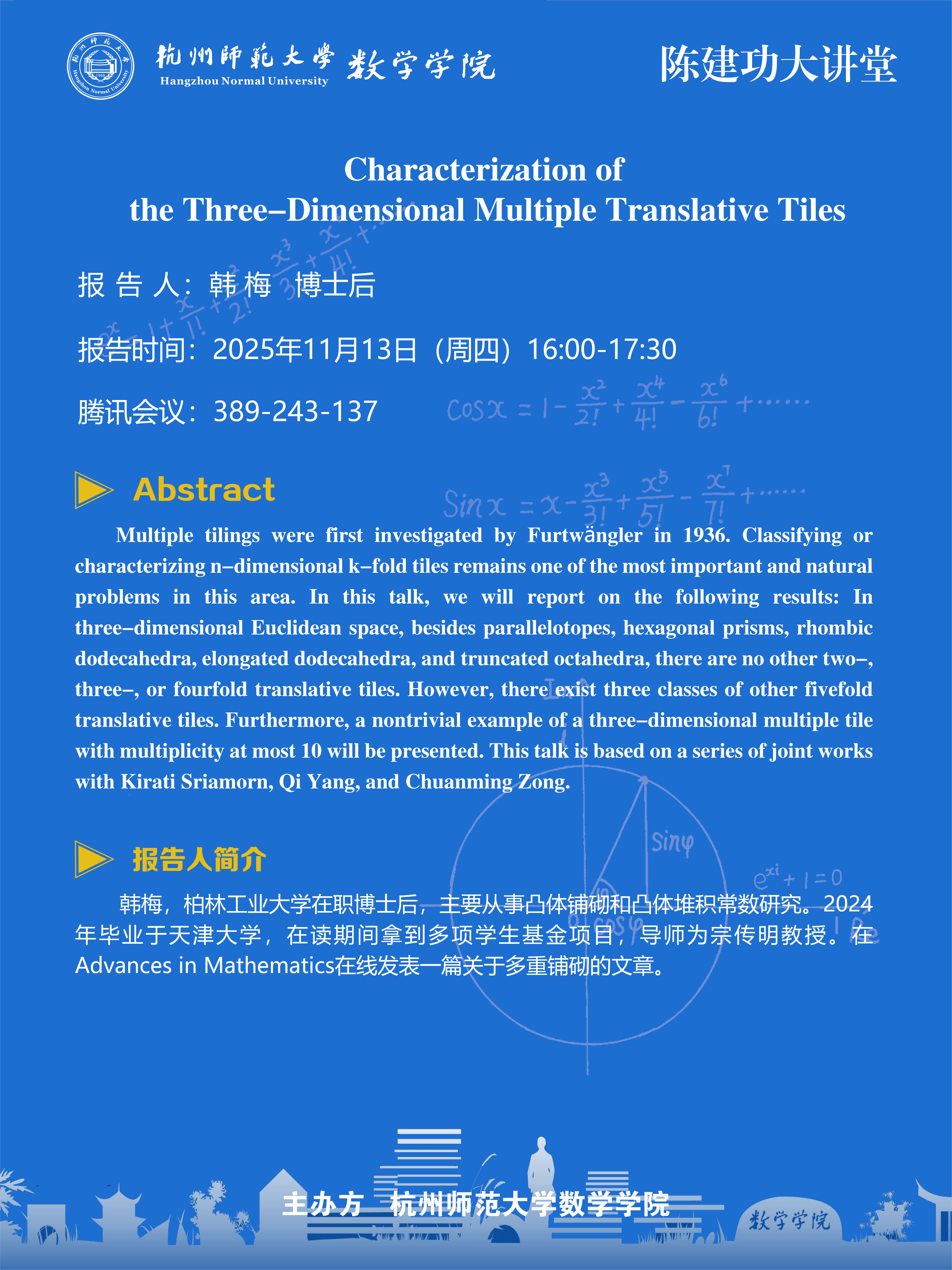 陈建功大讲堂(2025-111):Characterization of the Three-Dimensional Multiple Translative Tiles