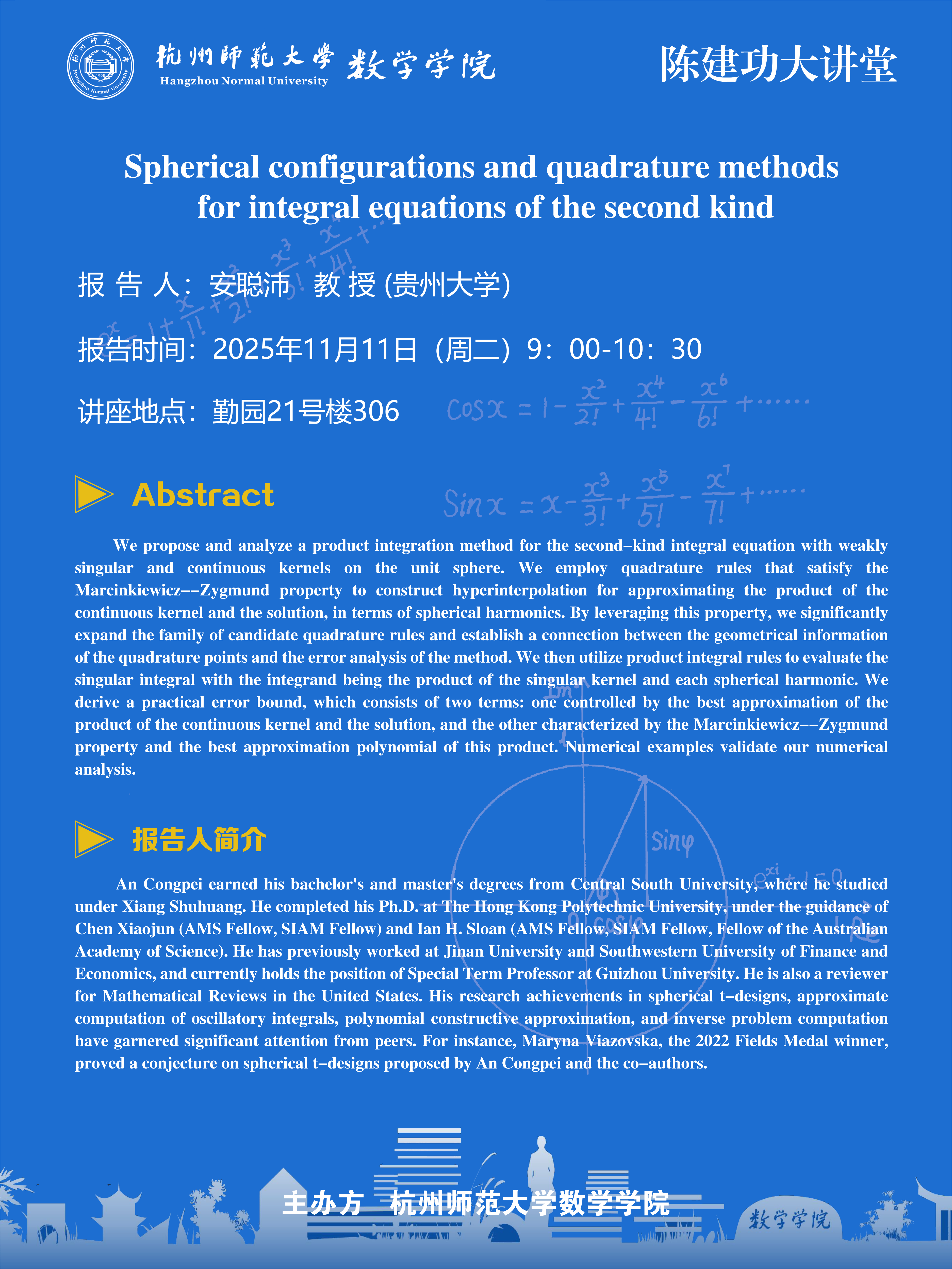 陈建功大讲堂(2025-117):Spherical configurations and quadrature methods for integral equations of the second kind