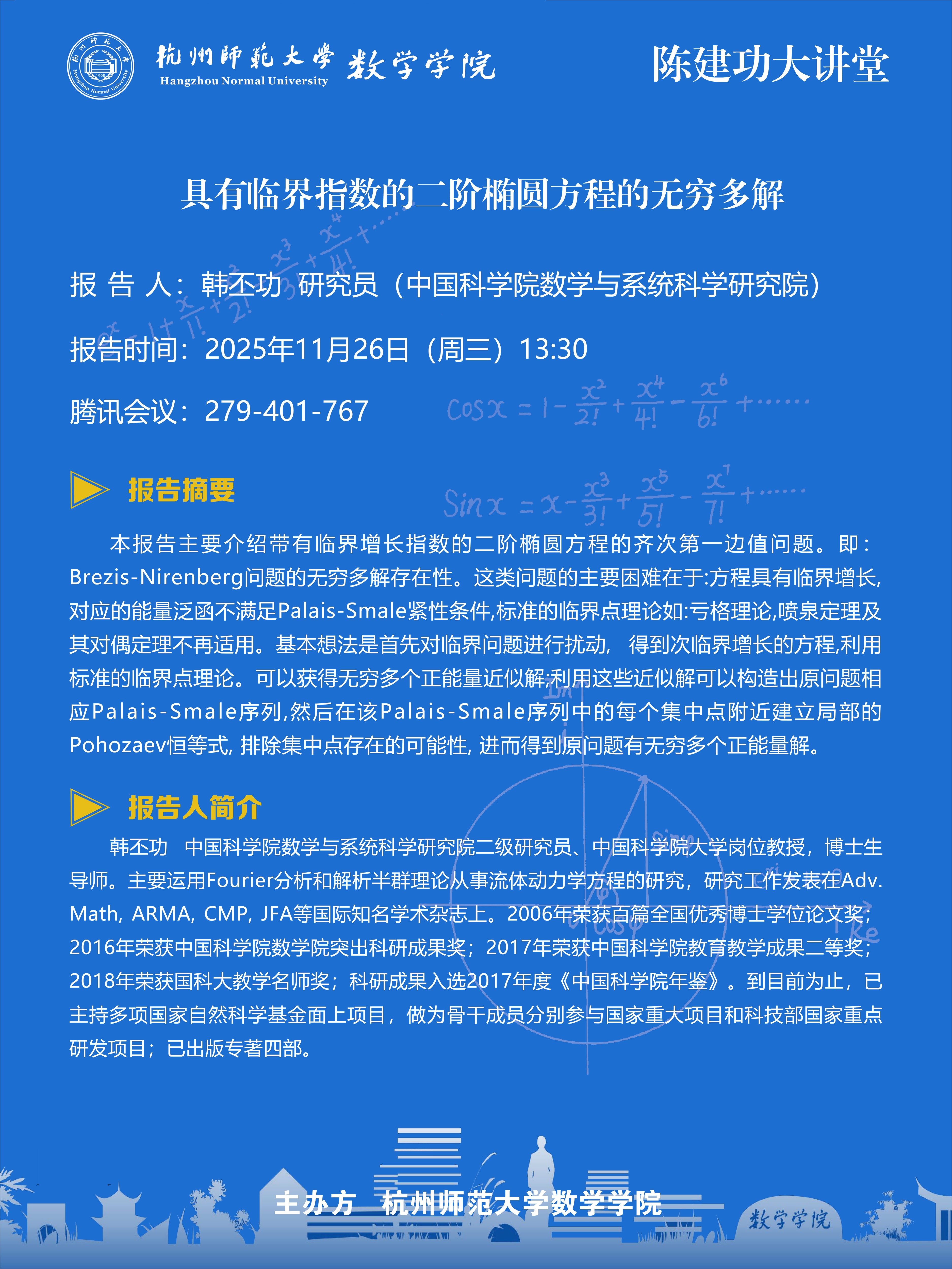 陈建功大讲堂(2025-143):具有临界指数的二阶椭圆方程的无穷多解