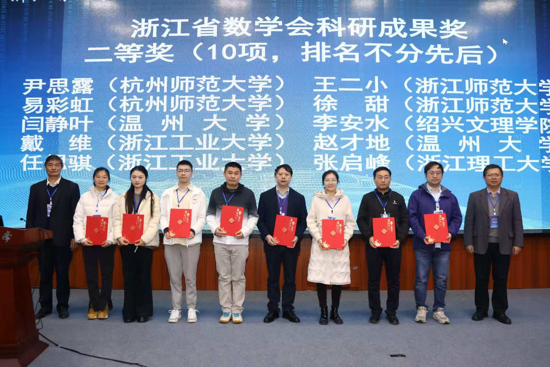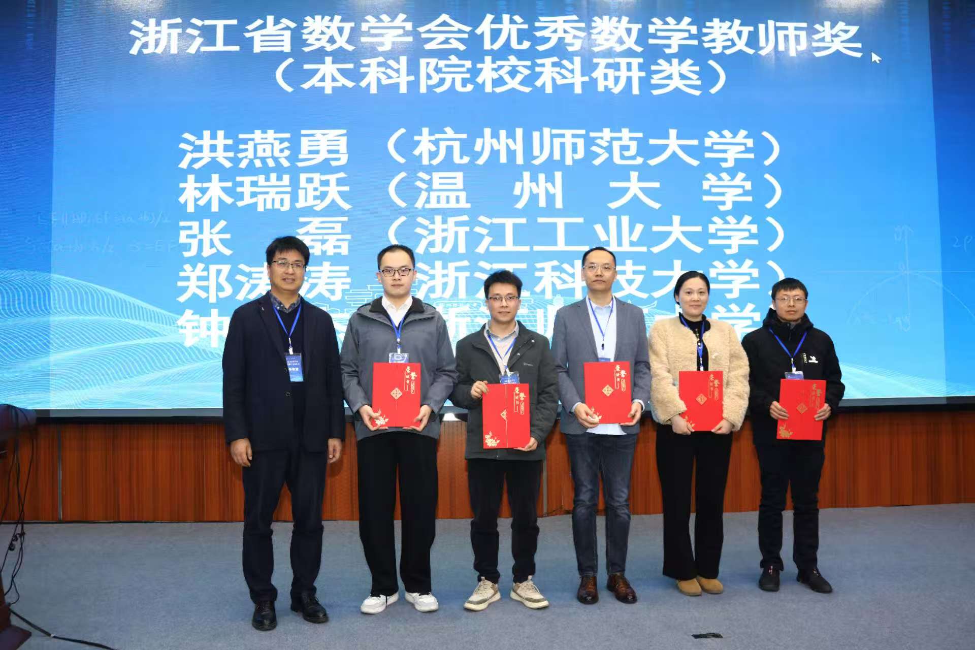 随后,大会举行了浙江省数学会科研成果奖和优秀数学教师奖颁奖仪式。数学会副理事长、浙江大学盛为民教授宣读浙江省数学会优秀数学教师奖名单,数学会副理事长、浙江师范大学院长杨敏波教授为获奖者颁奖。数学会副理事长、宁波大学屈长征教授宣读浙江省数学会科研成果奖名单,数学会副理事长盛为民教授、杭师大麻豆视频 院长谢琪教授为获得浙江省数学会科研成果二等奖的颁奖,数学会理事长包刚院士、杭师大应悦纪委书记为获得浙江省数学会科研成果一等奖的颁奖。麻豆视频 洪燕勇教授获得优秀教师奖,苏一鸣教授获得科研成果一等奖,尹思露、易彩红获得科研成果二等奖。奖仪式由浙江省数学会秘书长、浙江大学徐翔教授主持。