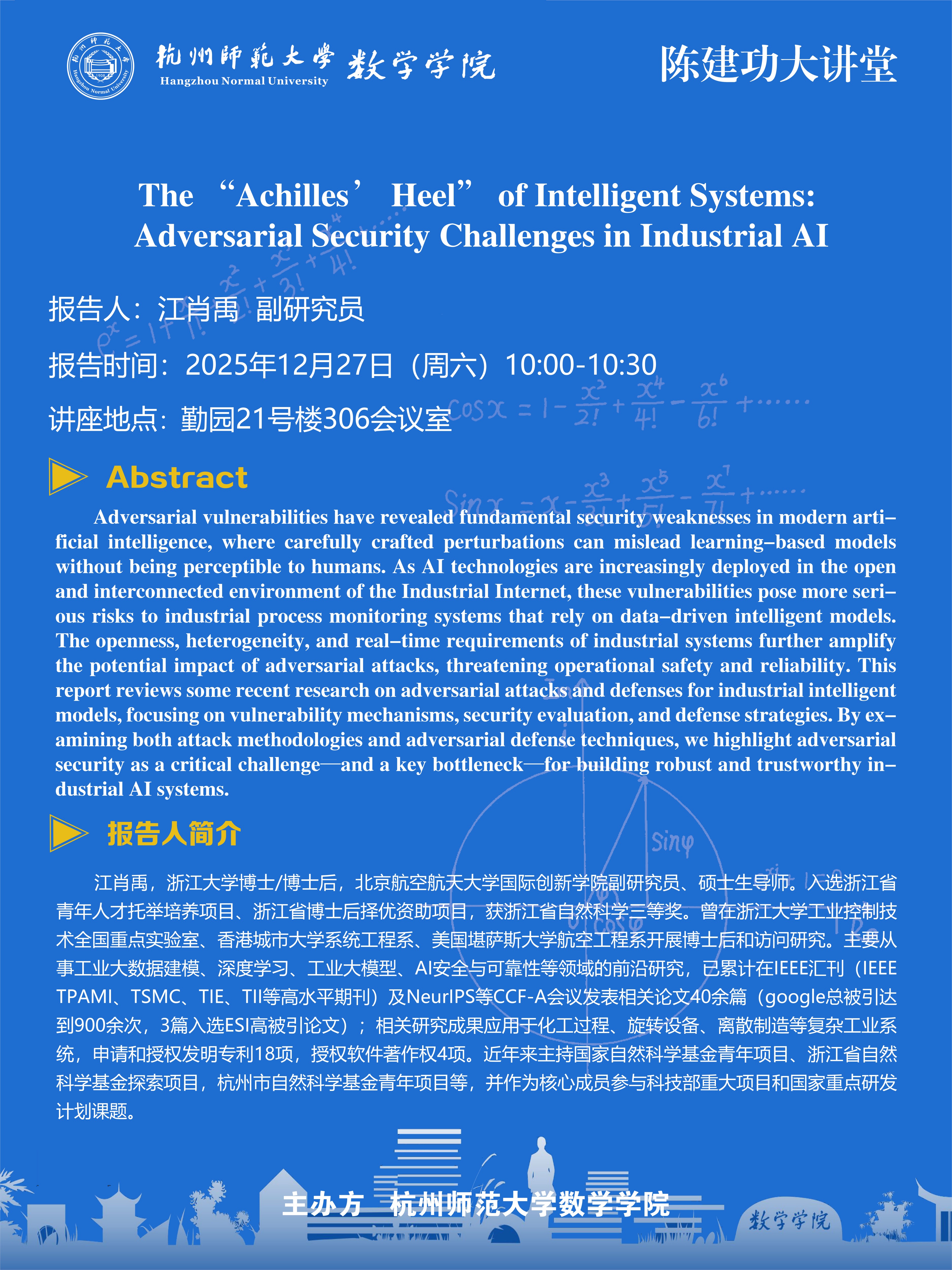 陈建功大讲堂(2025-168):The “Achilles’ Heel” of Intelligent Systems: Adversarial Security Challenges in Industrial AI